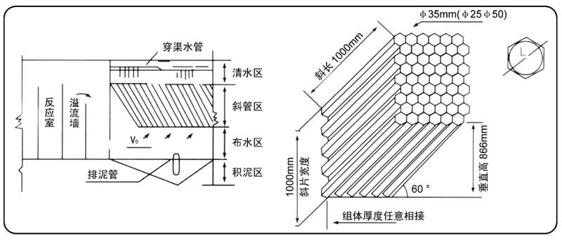 3. 當(dāng)斜管管長為1米時(shí),有效負(fù)荷按3-5噸/米2·時(shí)設(shè)計(jì)。V0控制在2.5-3.0毫米/秒范圍內(nèi),出水水質(zhì)最佳。