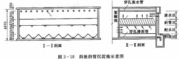 斜管斜板式沉淀池的結(jié)構(gòu)與一般沉淀池相同,是由進口、沉淀區(qū)、出口與集泥區(qū)四個部分組成,只是在沉淀區(qū)設(shè)置有許多斜管或斜板。圖3-16為斜管式沉淀池的典型結(jié)構(gòu)。